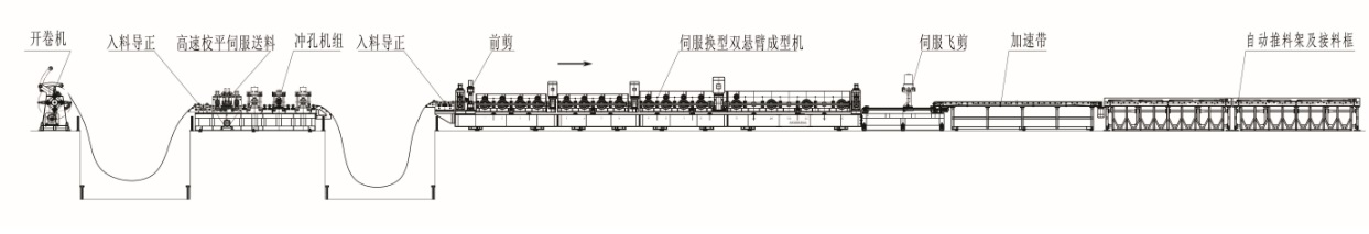 開卷機(jī)---入料導(dǎo)正--伺服送料--沖孔機(jī)組---導(dǎo)正---前剪---成型部分---伺服飛剪----加速帶----自動(dòng)碼垛機(jī)